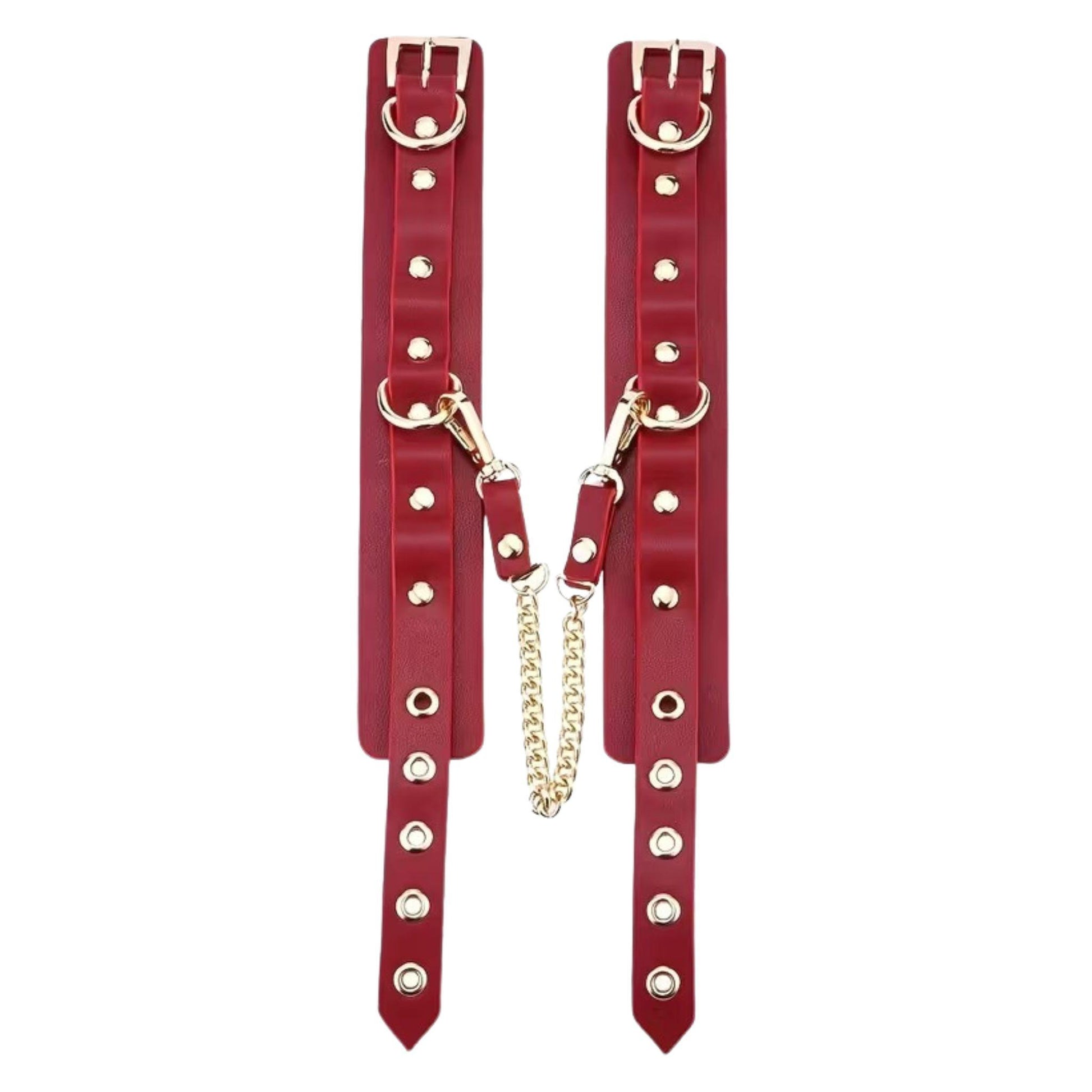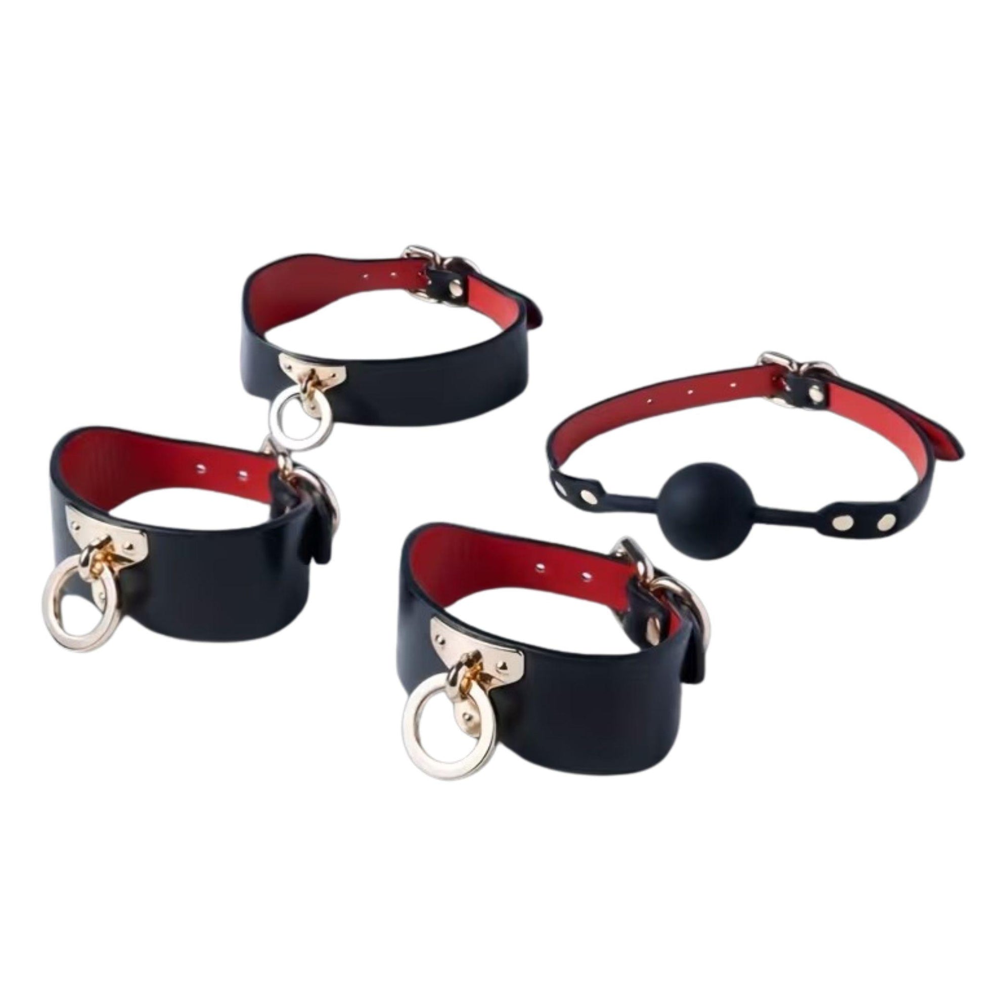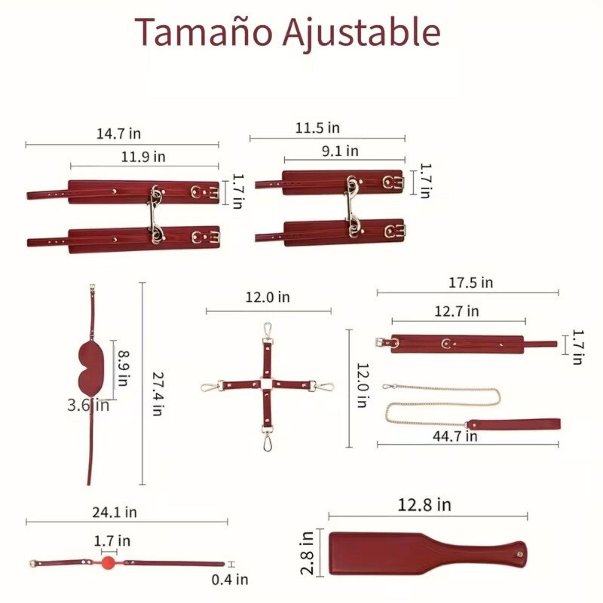 Imperio combina acabados en tono rojo vino profundo con herrajes metálicos resistentes, ofreciendo un set completo que permite múltiples configuraciones de restricción y control. Visualmente impactante, funcionalmente versátil.