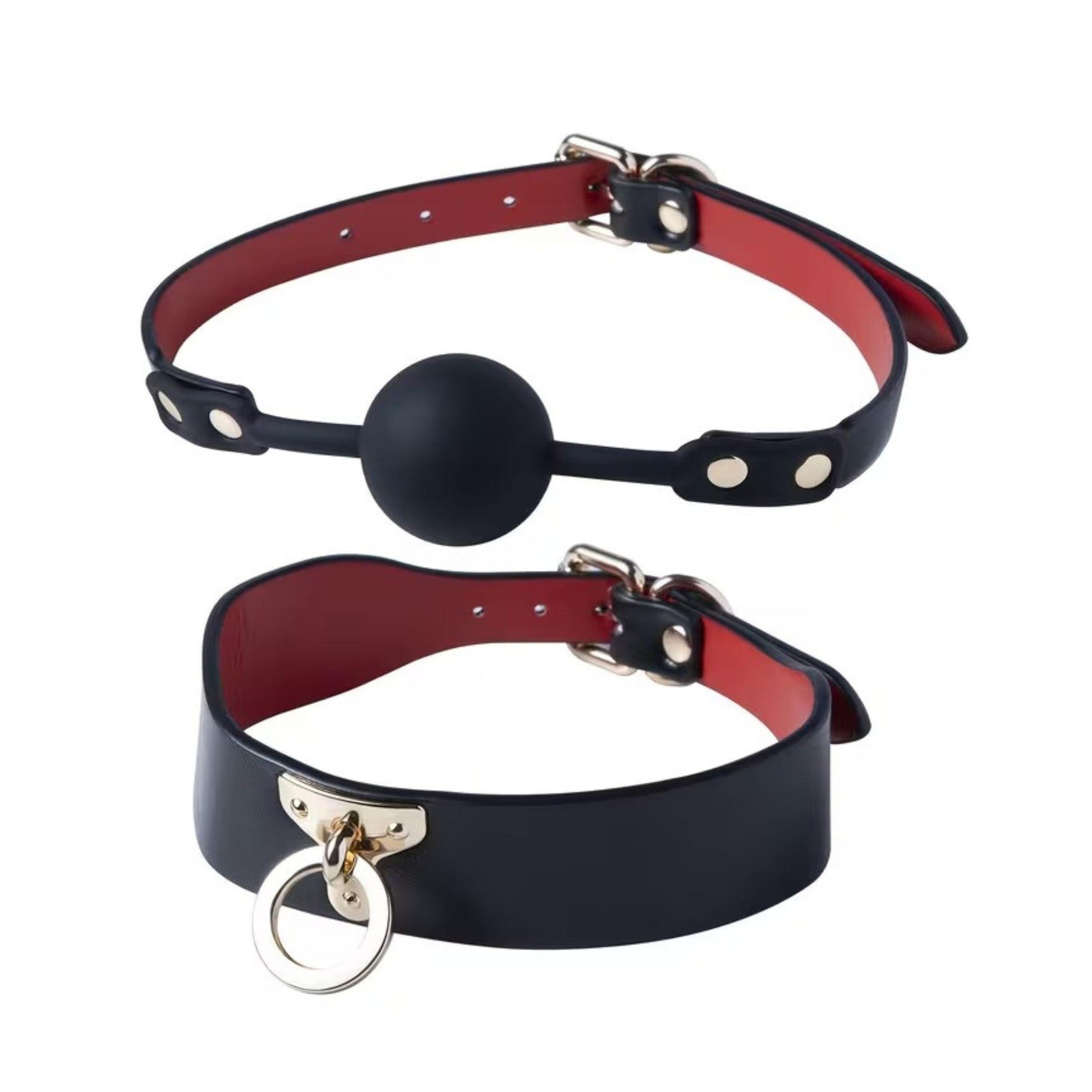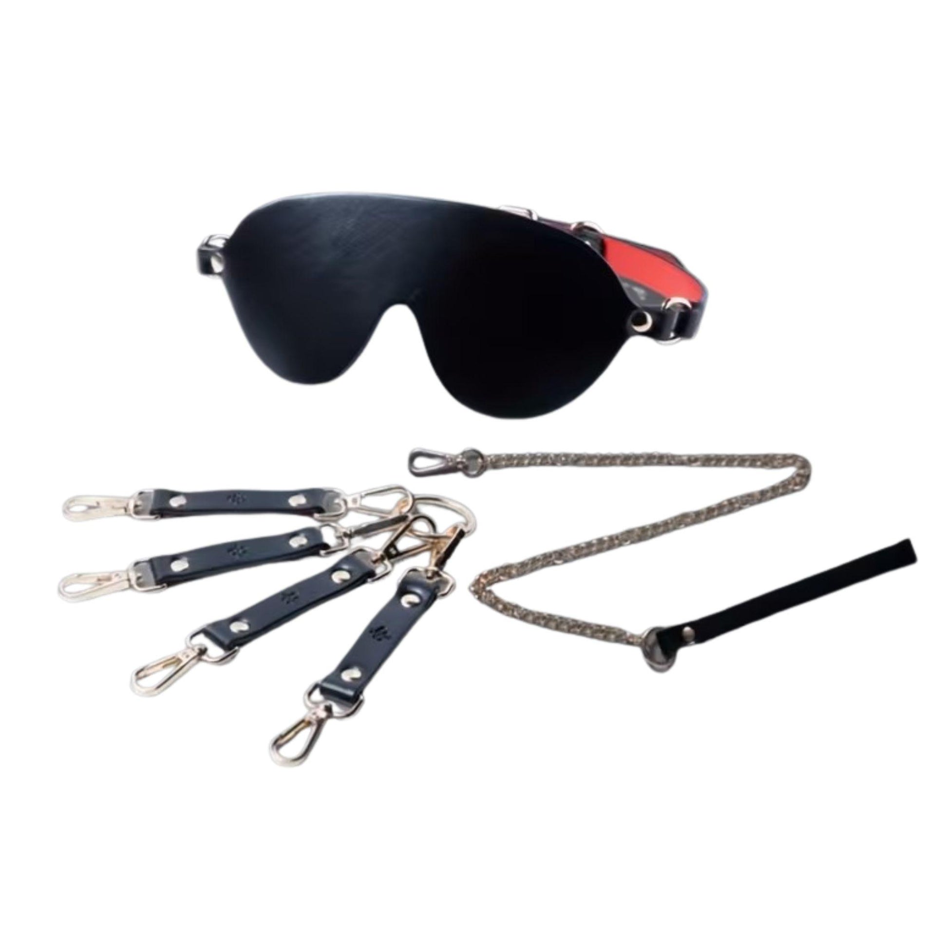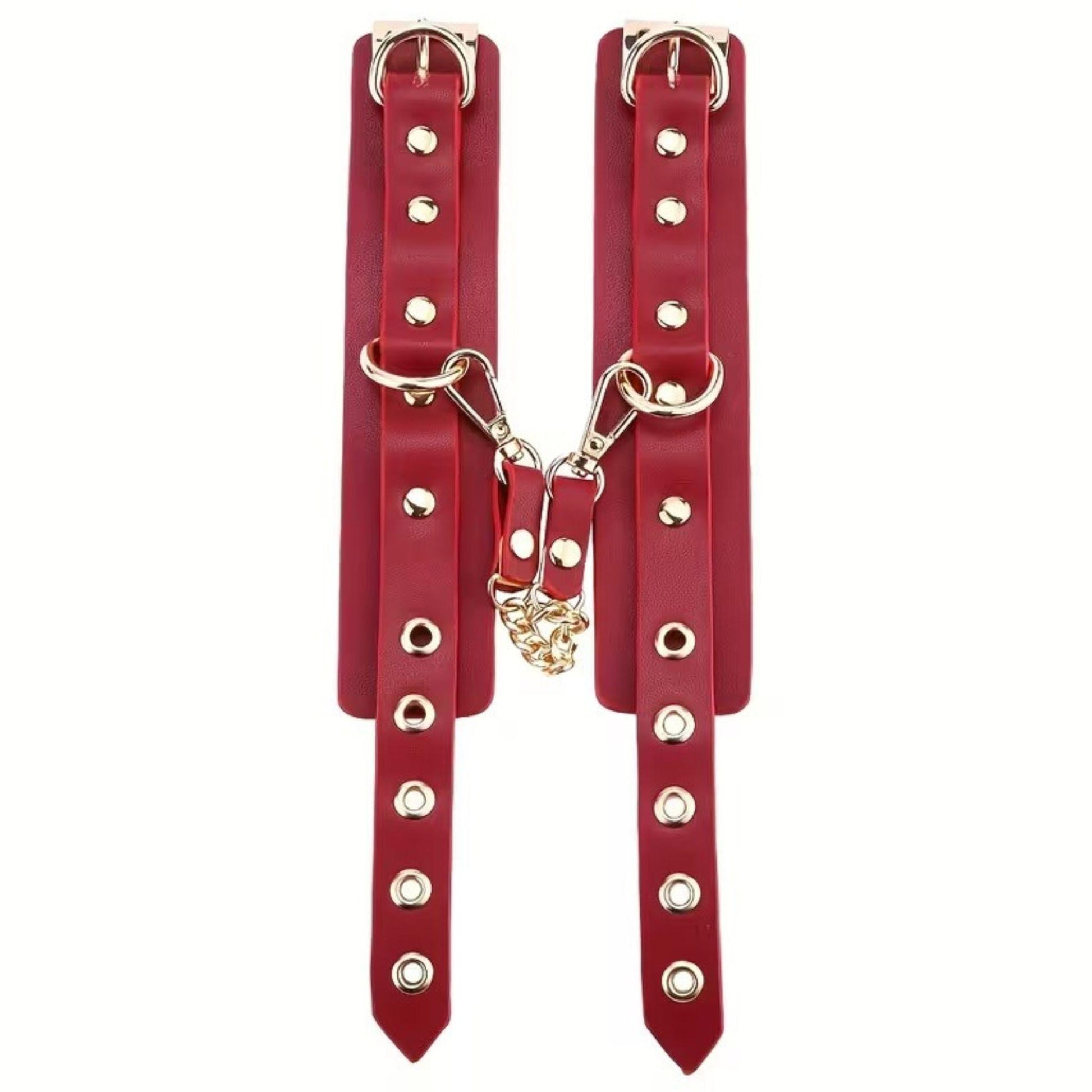 Imperio combina acabados en tono rojo vino profundo con herrajes metálicos resistentes, ofreciendo un set completo que permite múltiples configuraciones de restricción y control. Visualmente impactante, funcionalmente versátil.