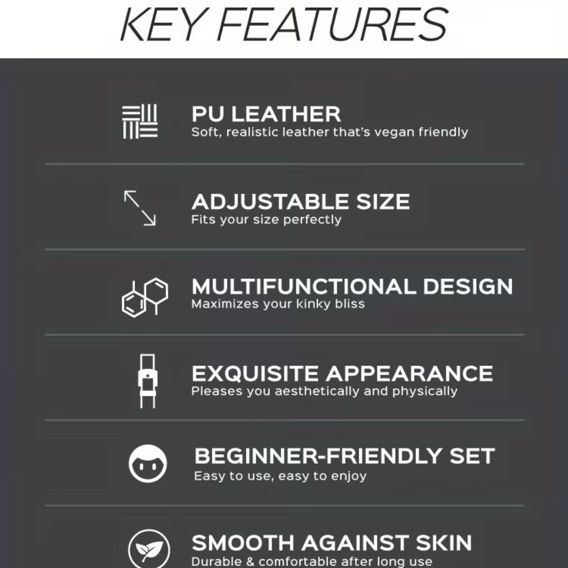 Antes de usar, ajusta cada pieza al tamaño adecuado asegurándote de que las correas queden firmes pero cómodas, permitiendo circulación normal y sin causar dolor involuntario. Acuerden siempre límites claros y una palabra de seguridad previa al juego. Después de cada sesión, limpia las piezas con un paño húmedo y jabón neutro, sécalas completamente y guárdalas en un lugar fresco y seco
